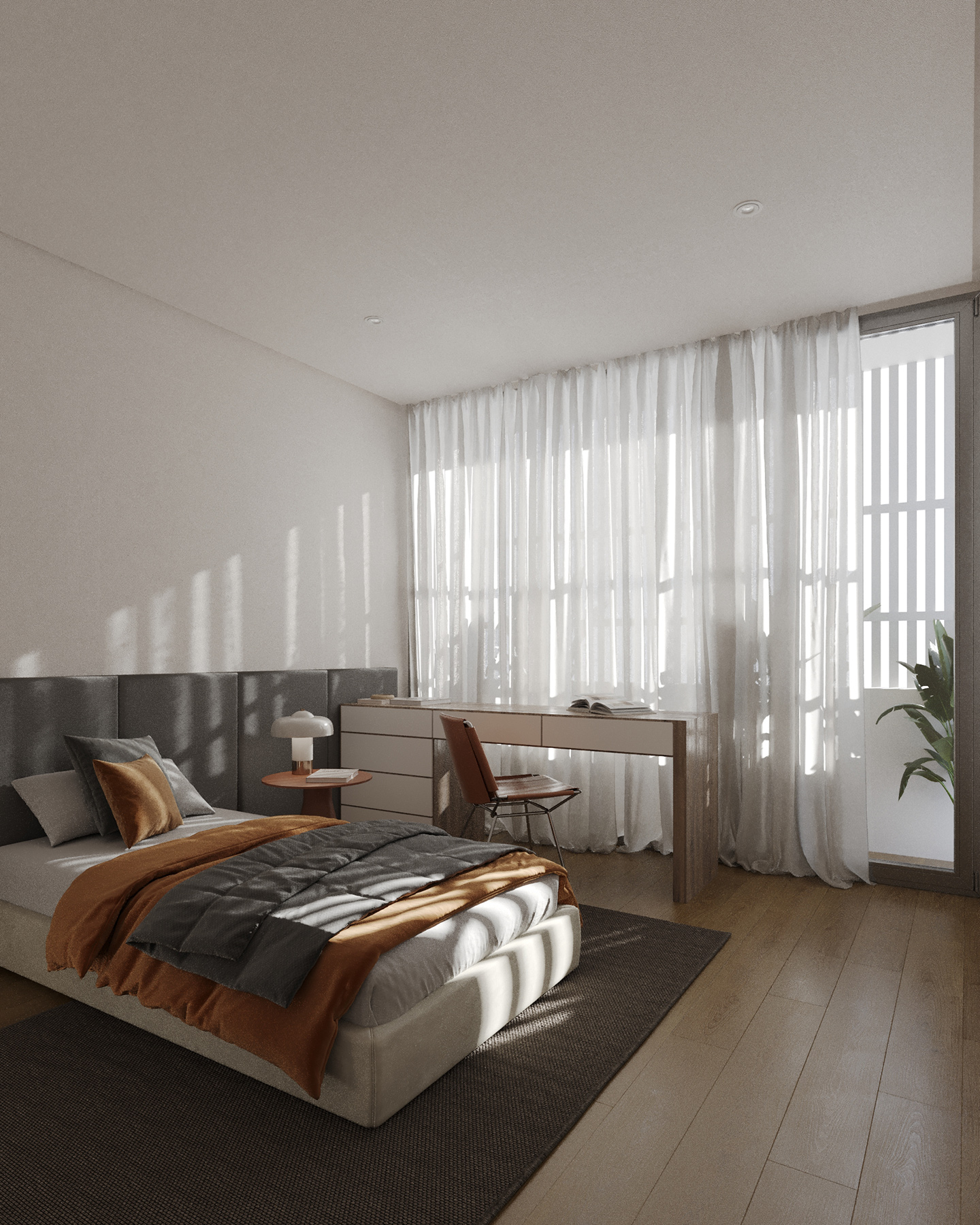 A central double-height void connects the ground and upper floors, becoming the spatial core of the house. A staircase traces that vertical transition, mapping the natural journey between the public and private areas of the home.