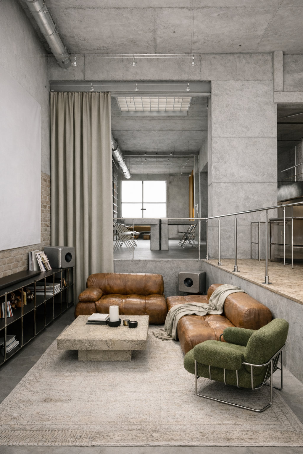 The central courtyard organizes the entire project. Every workspace maintains direct or indirect views toward that void — a space that enables pauses rather than programmed activities. In a creative economy where the boundaries between work and life blur, the architecture acknowledges the need for decompression and incorporates it as a spatial device.