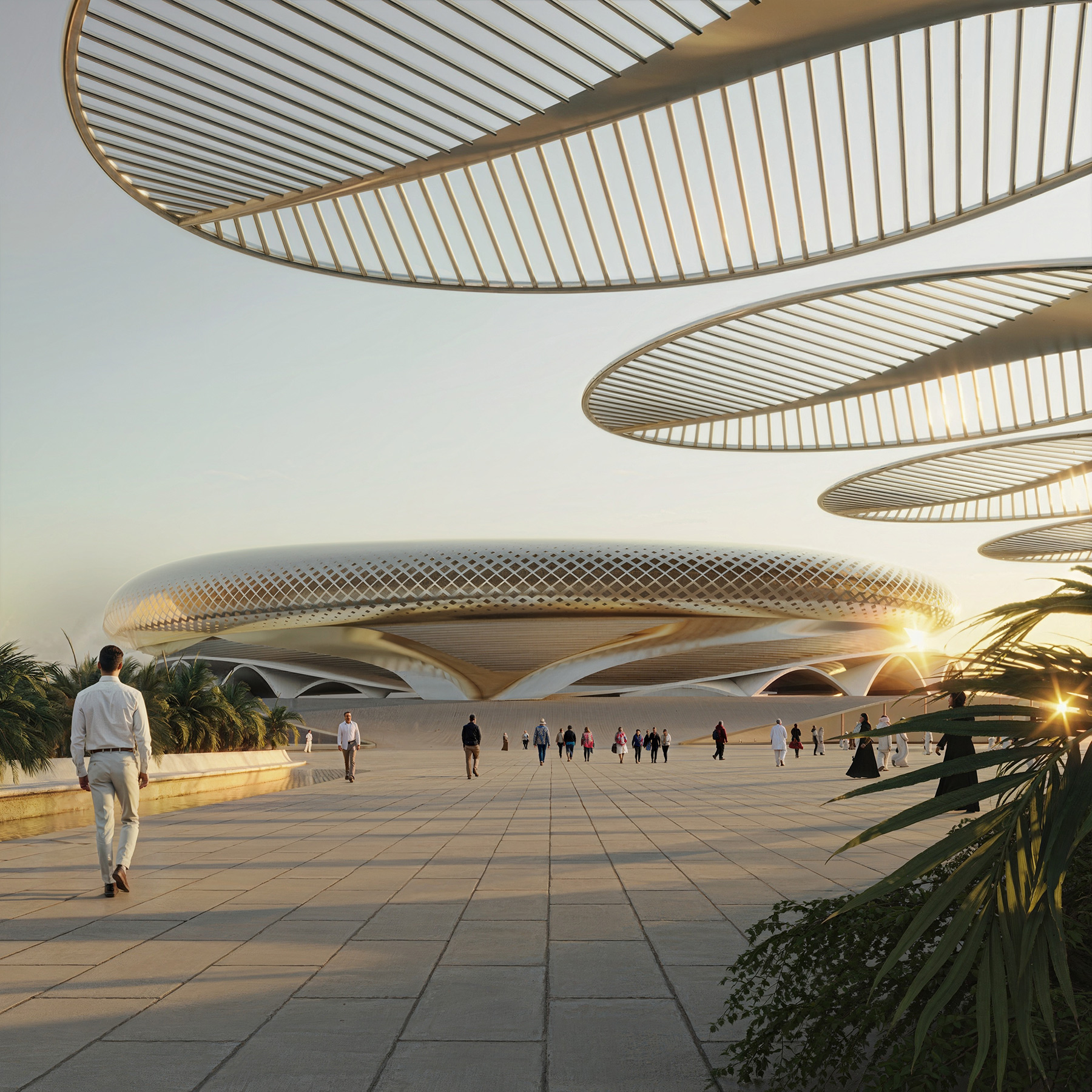 The hotel tower organises the vertical presence of the ensemble and opens a dialogue with Riyadh's skyline. Its rooms and suites translate a promise of precision and comfort into physical space, while the semi-covered stadium resolves the relationship between spectacle and climate with intelligence — sheltering spectators without severing them from the energy of live sport.