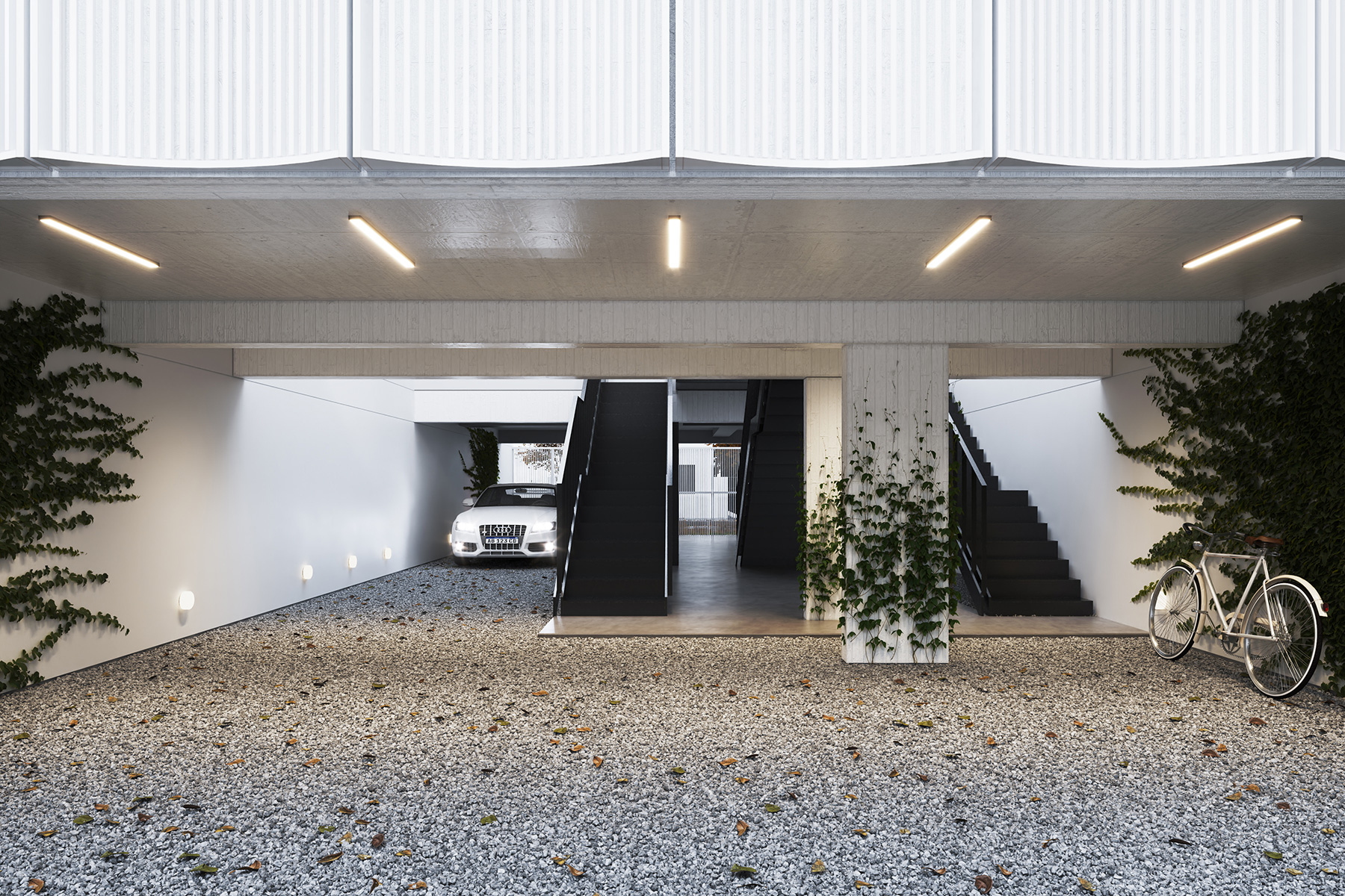 The massing is organised into two main volumes separated by an interior courtyard — an element that governs the access logic while ensuring natural ventilation and light across every unit. The ground floor is devoted entirely to communal spaces, whose integration amplifies spatial perception and occupies the full length of the lot.