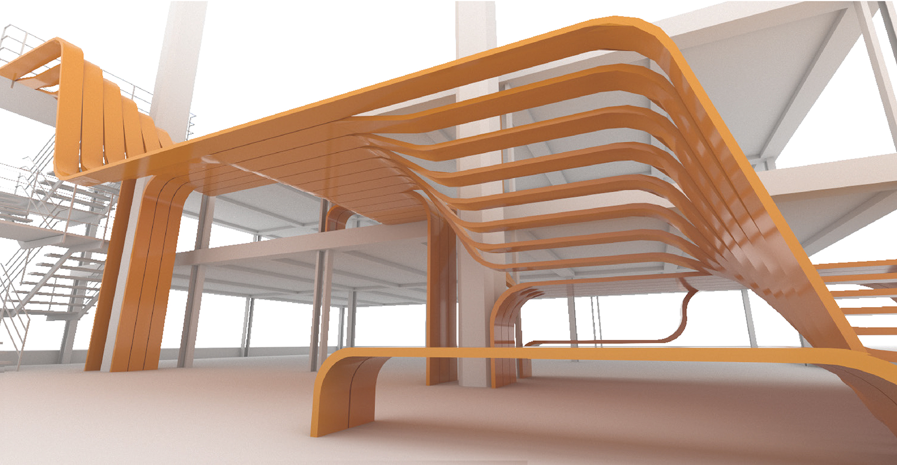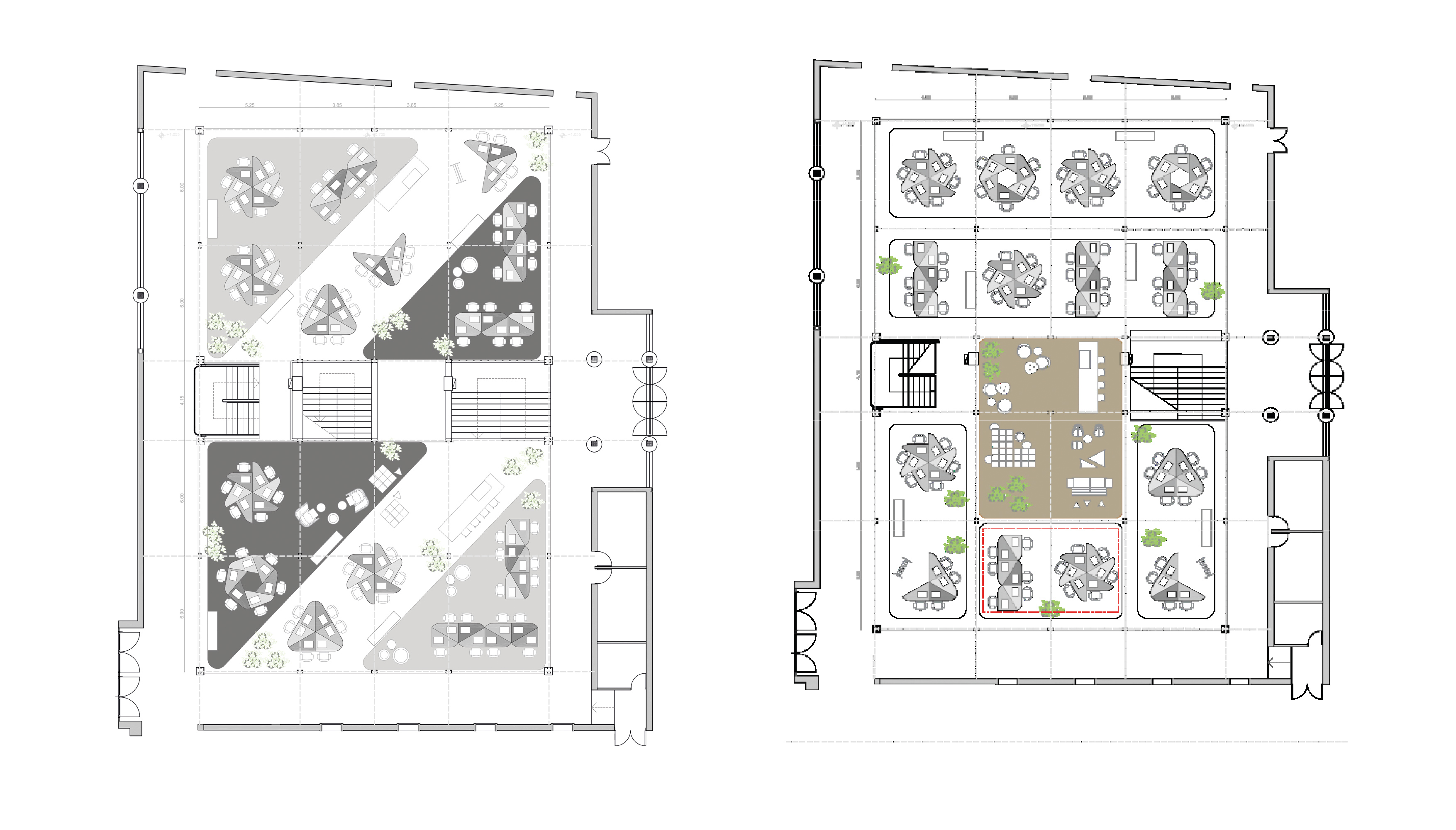 A cascade-shaped triple-height void links the building's different levels into a continuous system. The staircase that runs through it operates as an identity element: recognisable, functional, and capable of unifying the entire space under a single spatial logic. Furniture modules follow that same logic, allowing reconfigurations to suit shifting needs throughout the day.
